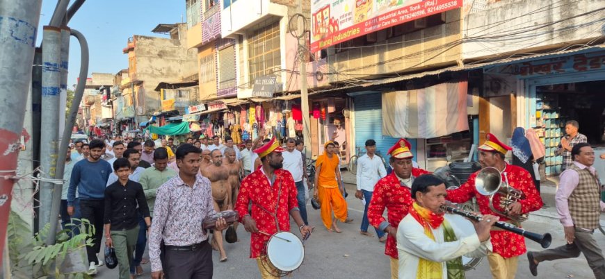 परम पूज्य आचार्य श्री वर्धमान साग महाराज का पुरानी टोंक में पंचकल्याण महोत्सव समापन के पश्चात आचार्य ससंघ विहार करते हुए बैंड बाजे के साथ घंटाघर सुभाष बाजार बड़ा हुआ होते हुए जैन नसिया में मंगल प्रवेश हुआ